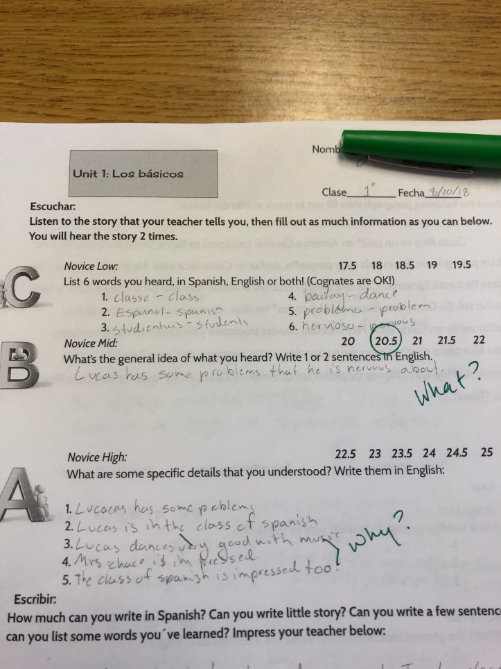• If a kid wrote 3 words and tried to turn it in, I’d give it back and say, “look around the room… do you see any words you can copy down?” Literally, copying down words is Novice Low… there’s nothing below that! Now if I kid refuses to write/copy anything… that’s another story and would result in a zero. This aligns with NV’s proficiency target for Level 1- at the end of the year the target is Novice Mid, so anything exceeding that is an A and anything not quite is a C. I haven’t had any parent pushback and kids love knowing that if they try, they’ll at least earn a C