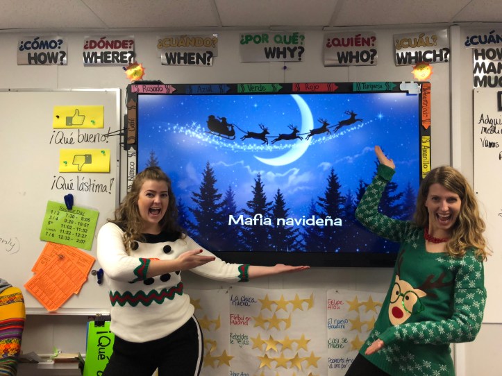 But it’s all good. I’m blessed to have a job I love, little darlings I love, and super blessed to get a 2 week break in 5 days! And I’m out-of-this-world blessed to work with Amy, my former student now colleague! She helped me work out the kinks and iron out the details for Christmas Mafia. (Today was Ugly Christmas Sweater Day but we only have Awesome Christmas Sweaters, so…)