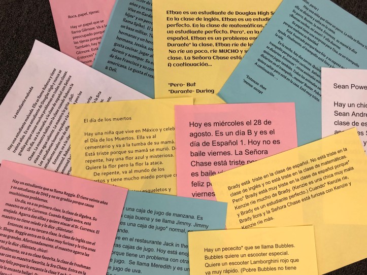 My lovely TA printed out all the Spanish 1s documents and made 2-3 copies of each one, on different colored paper. (So the Día de los muertos story was printed on yellow, and Sean’s Estrella del Día Biography was copied on pink and the Rock, Paper, Scissors story was copied on green and Buster the Boxer was white and so on. Since my school only provides 5 colors of copy paper, there were more than one story on the same color, but all the copies of Karen la Avestruz (our first One World Image!) were on blue, but there were also copies of Jimmy, la caja de jugo (another One Word Image) and our Principal’s biography also on blue. Then my TA shuffled them nicely, so that they were all mixed up, and as I stood at the door, greeting my Little Darlings and listening for their Palabra Secreta, I handed each a story. Let the shuffle begin.