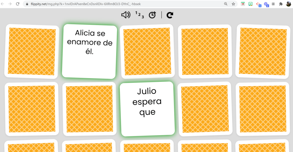 • Everyone who has the link will have their own game- so great for individual practice. If you want to play together as a class, you should open one game and projected for everyone to see. Take a look at the blog post called “parejas” to see an example!!