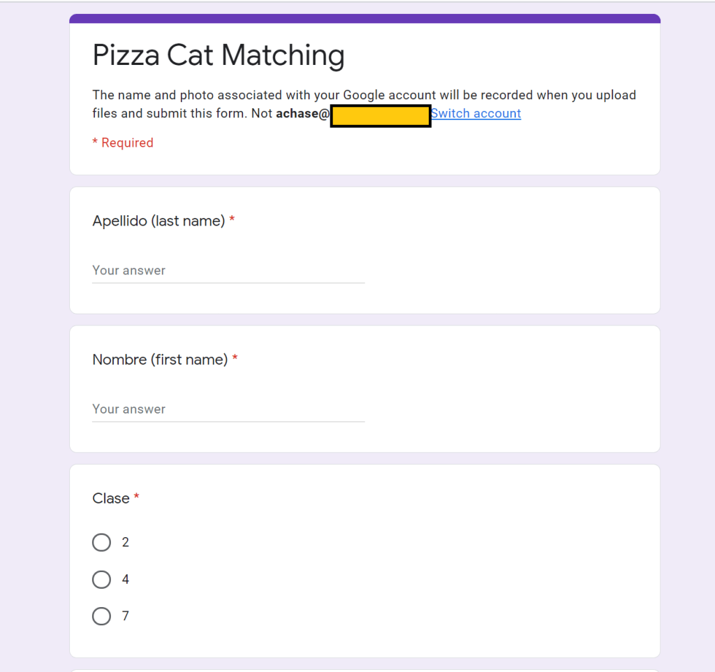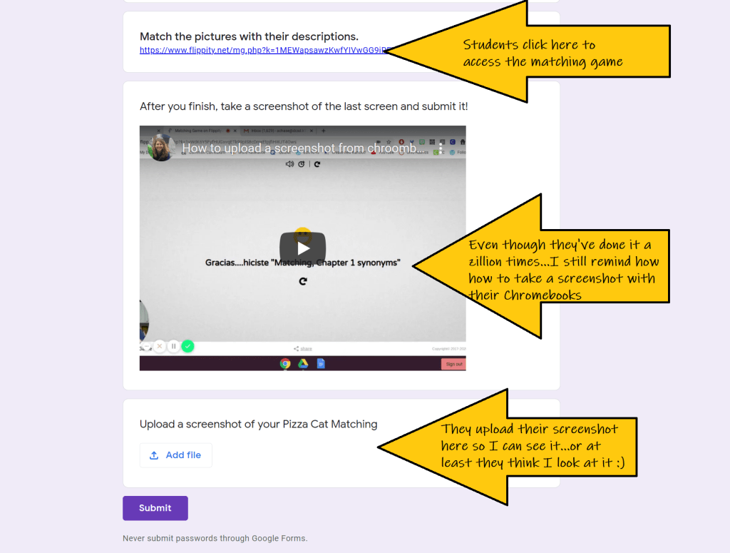 And if you want to add just a touch of accountability, you know, so you know they’re actually doing their online assignments, I like to drop the link into a Google Form, and ask them to upload a screenshot of their completed memory game. The form looks like this: