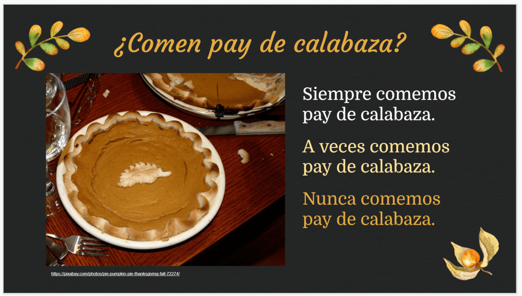 Once you have talked about traditional Thanksgiving food with Señora Chase´s Thanksgiving Picture Talk slides, here is a way to get more repetition and comprehensible input with the same vocabulary, plus sneak in some point of view changes.