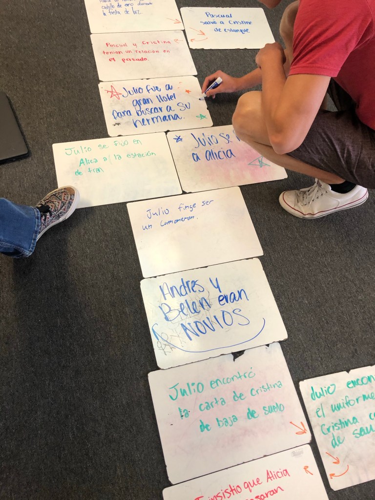 Then we established where in the classroom the timeline would begin (the very first thing to happen) and where the most current events would go. Then I turned them lose to read each others’ boards and figure out where every board should go. (Now, there’s a lot of drama in Gran Hotel that is revealed late in the game but actually happened much earlier…we went by the actual chronology of what happened, not when it was revealed, but you go ahead and follow your heart.)