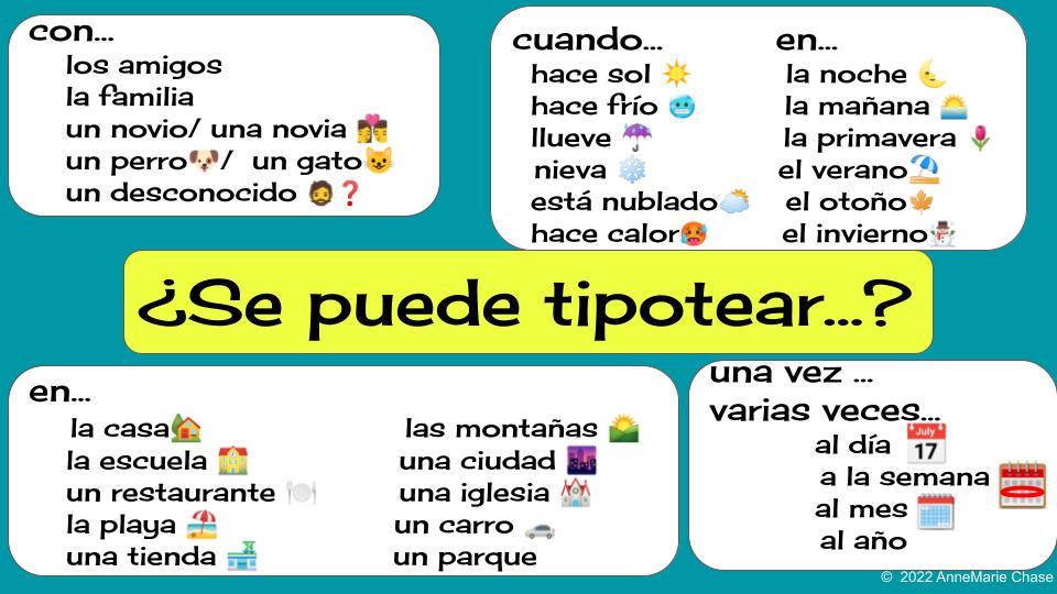 Play in the same way: Divide the class into two teams, each team writes a verb on a min whiteboard, and display the boards so that only their team can see it. Project this slideshow to assist them in asking questions. Since our goal is always to give them loads of input, after each question and the other team answers, the teacher summarizes all the information we know so far, in slow and comprehensible language. Hmmmm….you can’t tipotear with another person and you usually tipotear when it’s sunny outside. Most people tipotear several times each week, and you can tipotear at school. Hmmm…what could it be?