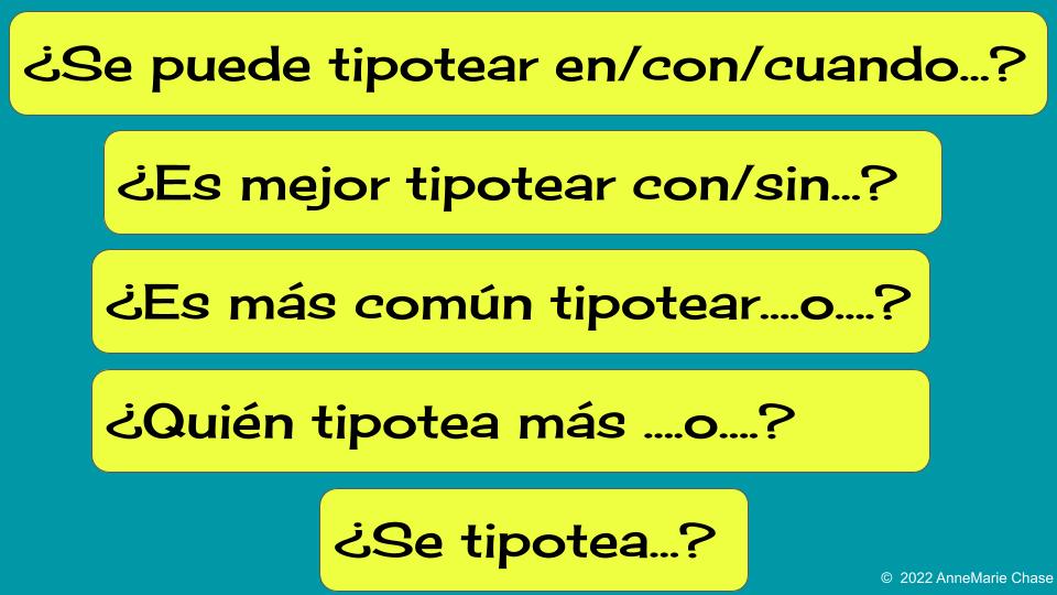 I made a few adjustments to make this work better in the classroom. First, I modeled it for them. I divided the class into 2 teams and on a mini whiteboard I wrote down a secret verb, and held the board so that only Team A could see the answer. I explained that Team B had to figure out the verb by asking questions, that Team A would answer. To get them started, I threw out a few questions, ¿Se puede tipotear en la iglesia? ¿Hay alguien en el salón que tipotee ahora mismo? ¿A quién le gusta tipotear? Once they caught on, they asked questions until they figured out the verb written on the board. Then I wrote a new one and Team A tried to figure out the verb while Team B answered their questions. For the practice round, each time had a chance to guess and answer the other team’s questions.