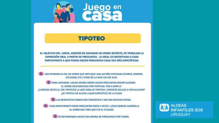 Basically someone thinks of a verb and everyone else tries to guess the verb, but using the made up verb “Tipotear” to ask questionsnuntil they figure it out. So I might be thinking of the verb “bailar“, and they might ask ¿Se puede tipotear en la casa? ¿Se puede tipotear solo o se tipotea con amigos? ¿Tipoteas más adentro o afuera? ¿Tipoteas varias veces a la semana? and so on until they figure out the secret verb.
