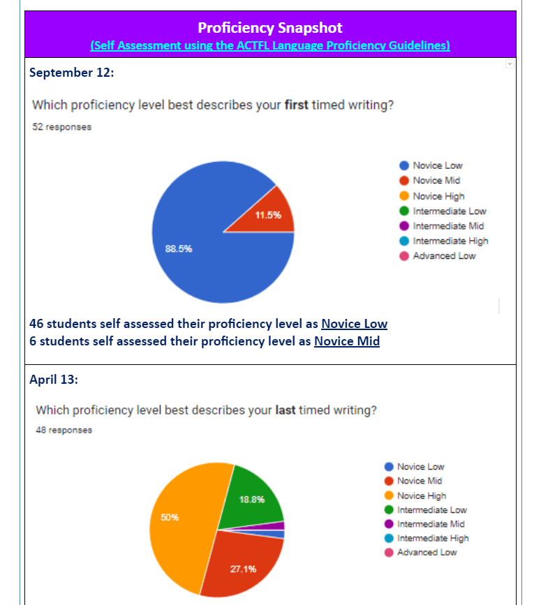 And their self assessed Proficiency Level increased! Who would have thought that feeding them 8 months of compelling and comprehensible would actually do something in their little brains?! (Except for that one kid, who moved here in March, just ignore that sliver of Novice Low🤣!)