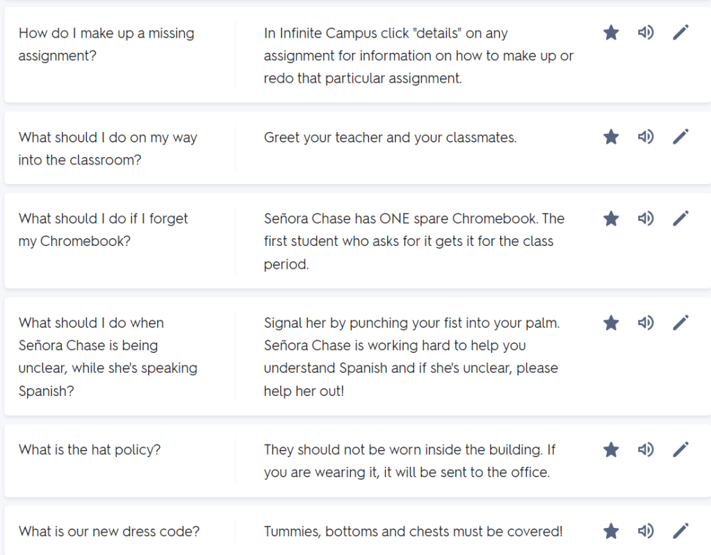 But those Classroom Policies and Procedures are important and I think, the secret to a smooth year is starting out strong with the classroom management. So, to introduce the way our classroom runs in a community building sort of way, last year I tried something new. I dumped all my classroom policies and procedures into a Quizlet Set, in the form of questions and answers. Take a look at my set for inspiration, but please oh please, make your own set. It will be weird if they start referring to you as Señora Chase.