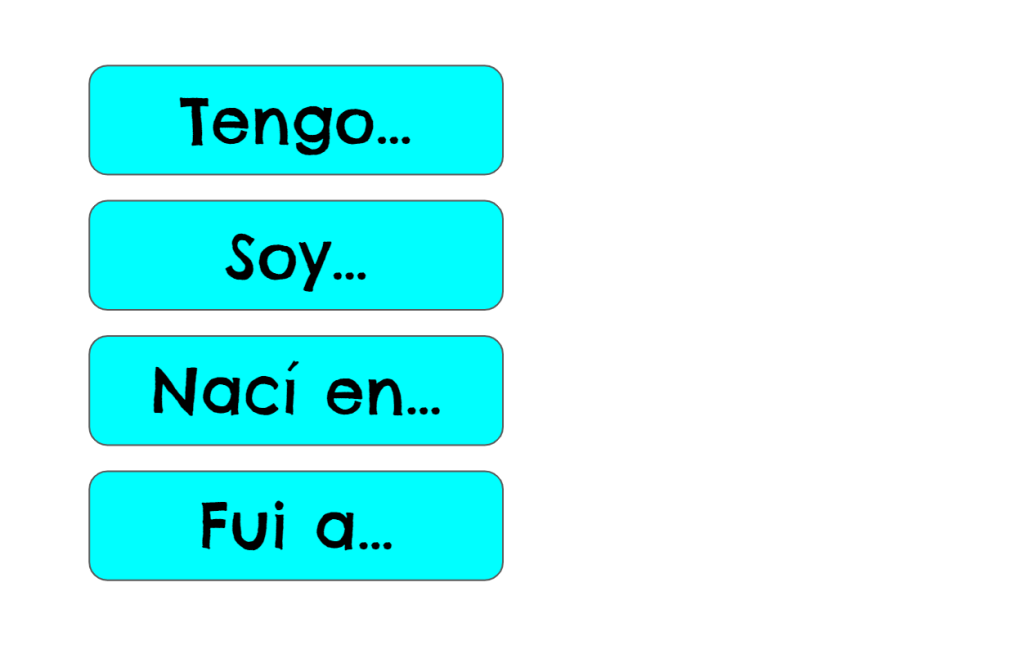 - Nací en…(I was born in…) / Fui a… (I went to…) For this one students picked one of the two options. “I went to the gas station this morning” OR “When I was 7, I went to Disneyland” OR “I was born in Kansas City or…