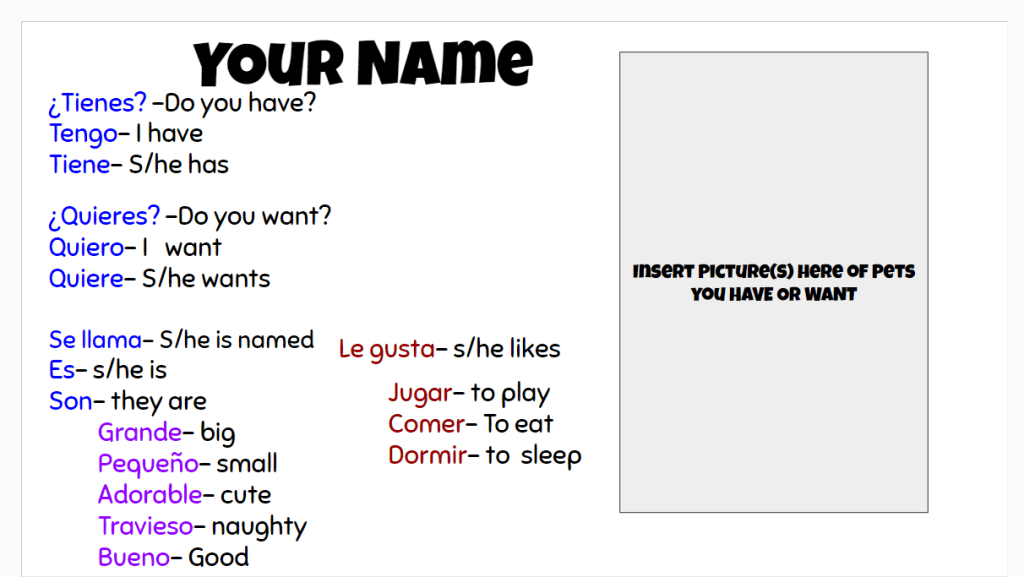 Right at the beginning of Spanish 1, we talk about the pets they have and the pets they want. For one, everyone love talking about their furry friends AND it’s a great way to get in a zillion reps of some high frequency heavy hitters like “has”, “wants” “is named” and “likes to play/ eat/ sleep” to start the year off strong. It’s a low stress way to interact, gush over cute puppies and give them loads of comprehensible input. Bonus: there’s always the kid who puts in a picture of a gorilla or a T Rex or a centaur or the Fortnite Horse which is fantastic to discuss.