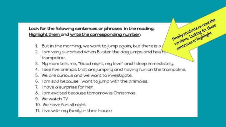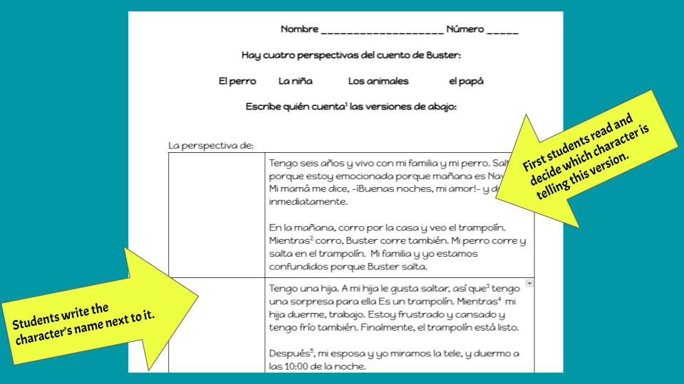Here’s what I’ve been playing with this year: after every Clip Chat, I tell them that we’ll write out the story from one of the character’s points of view. We brainstorm the characters and decide which they want to choose. (It’s not exactly a democratic process, I make sure each class chooses a different character🤣) Then we do all the usual Write & Discuss goodness: discussing what happens next and collaboratively writing it together, while keeping it comprehensible, and referring often to the super simplified verb endings posted at the front of my classroom. (During the actual Clip Chat, I narrate the story and ask questions about the characters; it’s not until we’re sitting down to write it out that we change the perspective and it seems that the Write & Discuss format really gives them a chance to hone in on how the endings affect the meaning of the verbs.)