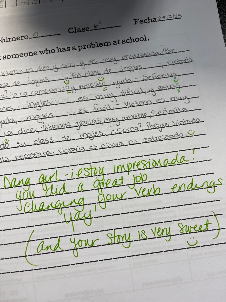 This year, more than ever, my Spanish 1 Little Darlings are internalizing the importance of the verb endings and how manipulating them changes the WHO and the WHEN. Are they using them perfectly? Of course not- they’re novices! But they are playing around with their verb endings in their writing and speaking and that is a very good first step! Just look at these beauties, taken from their most recent Celebrations of Knowledge:
