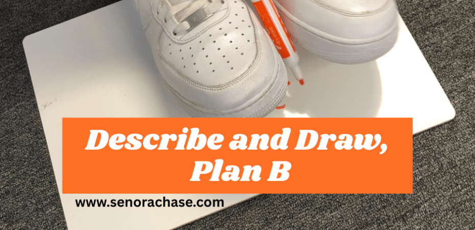 Step two: Same thing, but with a twist: Draw with your non dominate hand. Of course I demonstrate while explaining the twist in Comprehensible Spanish: Normalmente dibujo y escribo con la mano derecha. Ahora dibuja con tu OTRA mano. Wow, es mucho más difícil (as I draw a wonky stick figure on the board). We do exactly the same thing,I tell the next segment of previous story, while they listen with their markers capped, then they start drawing (with their non dominate hand). I retell and retell and they start giggling because their pictures are pretty goofy. I include lots of dialogue into this step because I’m evil like that! Then count down, reveal, and I tell it out of order as they point out the details. Pick another board to display upfront and it’s time to level up, again.