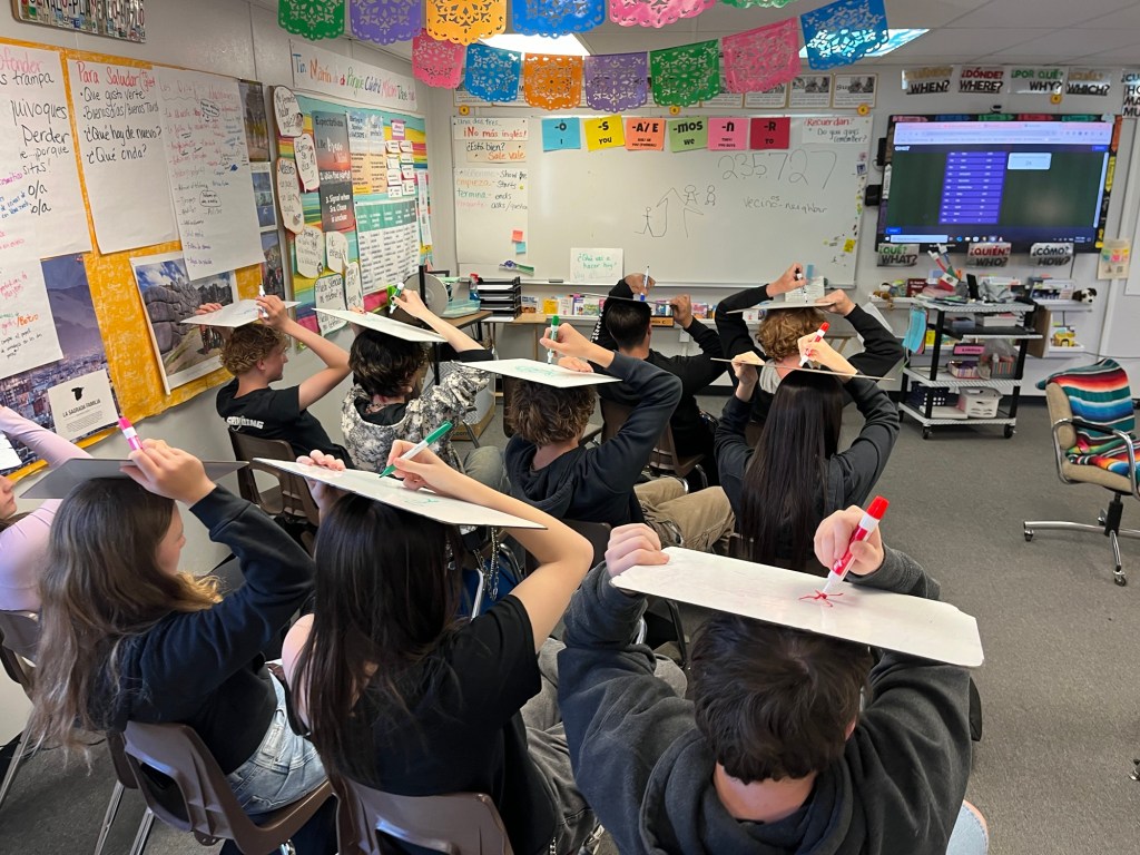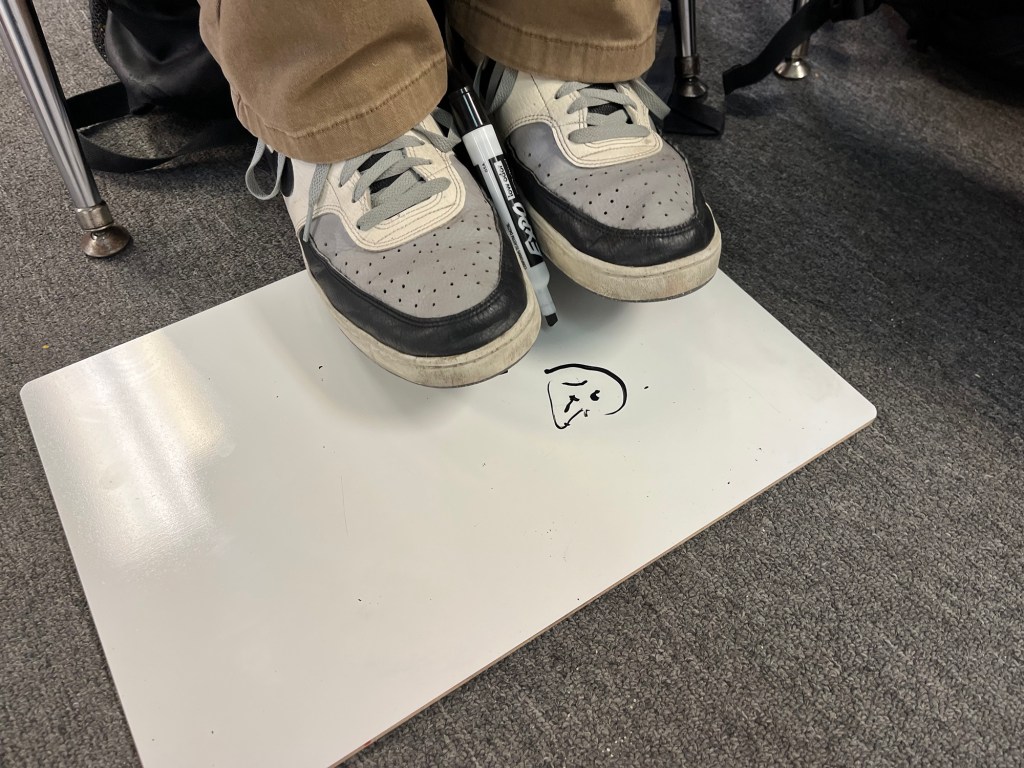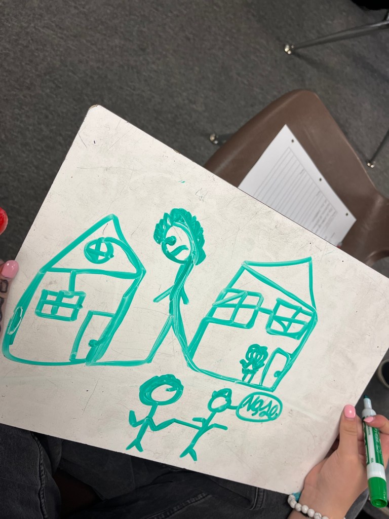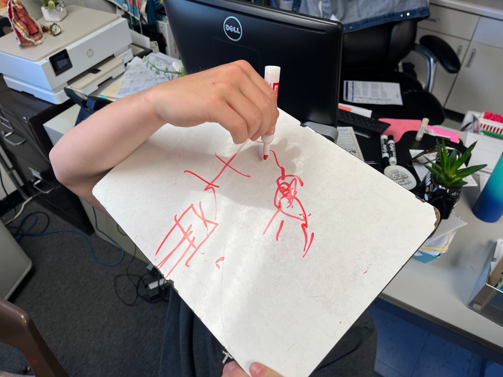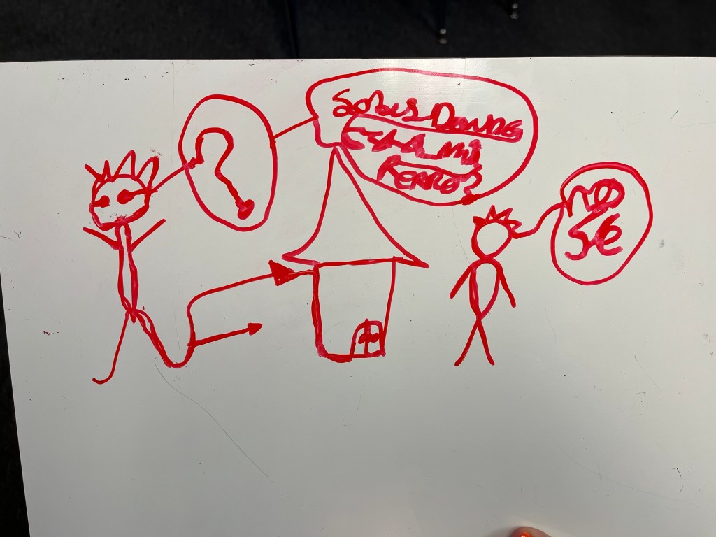 Step one: It stars out pretty tame: Everyone gets a whiteboard, marker and eraser. They listen to a short segment of a story, then they uncap their markers and illustrate. I retell that segment a few times, while marveling at their delightful illustrations, showcasing a few particularly creative or hilarious ones to the whole class, in slow and comprehensible Spanish. I count down cinco-cuatro-tres-dos-uno to signal it’s time to finish up their masterpieces, then everyone caps their markers and reveals their boards. I tell the story segment once more, out of order this time, while they point to their drawing that depicts that part. I pick one board to display up front and then we “level up”. (I don’t have any pictures of this part because this wasn’t the funny part…you just wait😂)