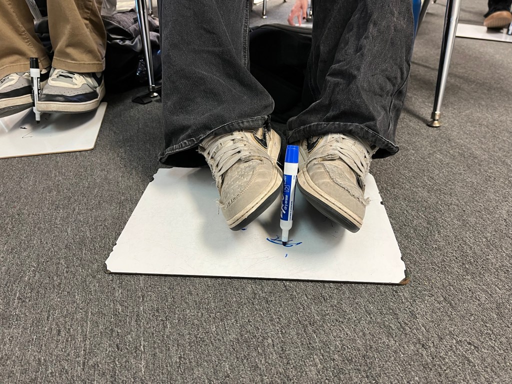 This Precious One figured out an clever work around: Rather than moving her feet, she held the pen with her feet and moved the board with her hands. Of course I needed to highlight to the class her ingenuity then six others wanted to try it. At this point we can barely hold it together, we’re laughing so hard.😂😂😂